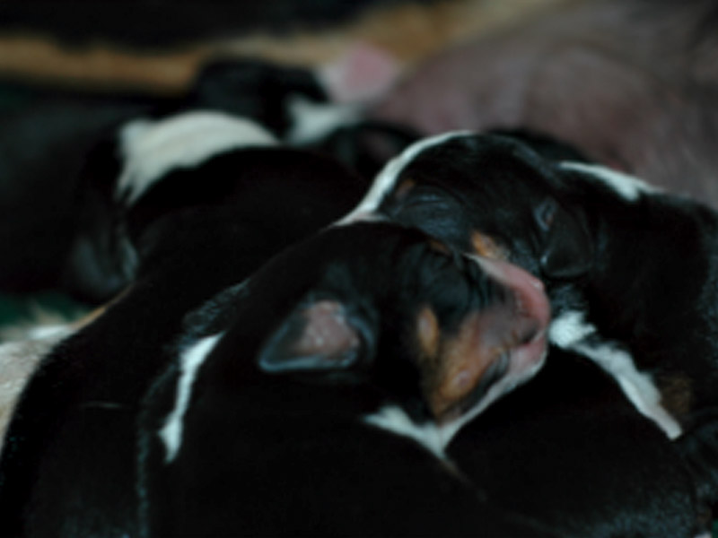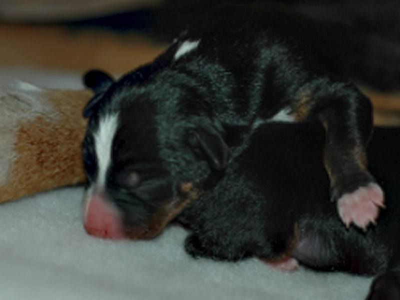 Um 23 Uhr aber ging es dann richtig los, die Wurf box wurde auf den Kopf gestellt, und auch alle umher stehenden Betten mussten unter den Kratzattacken leiden. Bis 3 Uhr quälten sie dauer Presswehen, und dann war es so weit. Der erste Rüde erblickte das Licht der Welt. So klein und zerbrechlich, mit 250 gr ein echtes Fliegengewicht. Das hatten wir noch nie so einen zarten Zwerg, aber er kämpfte sich ins Leben und bei Mama an der Brust wird der Geburtsstress schnell vergessen. Ja was soll ich sagen, bis zum Mittag um 12.5 Uhr erblickten 9 muntere Appenzeller das Licht der Welt. Quietsch fidel und unheimlich hungrig.