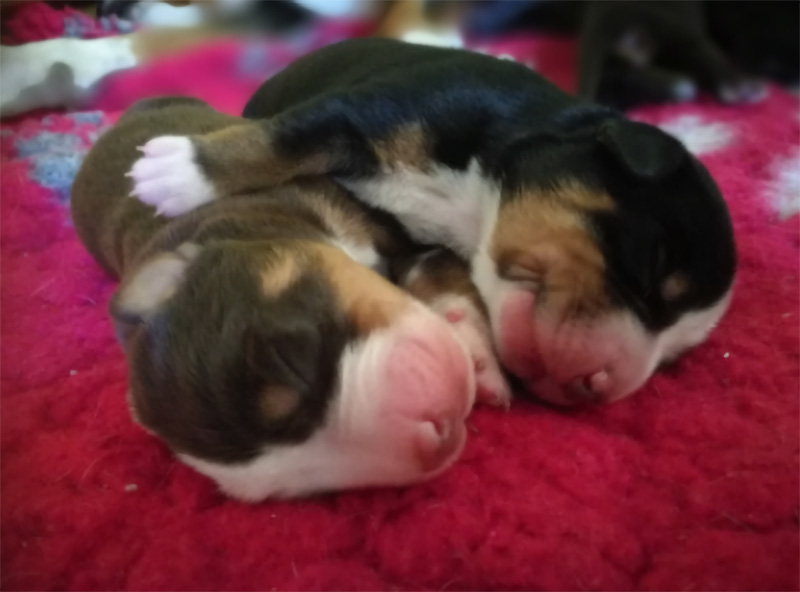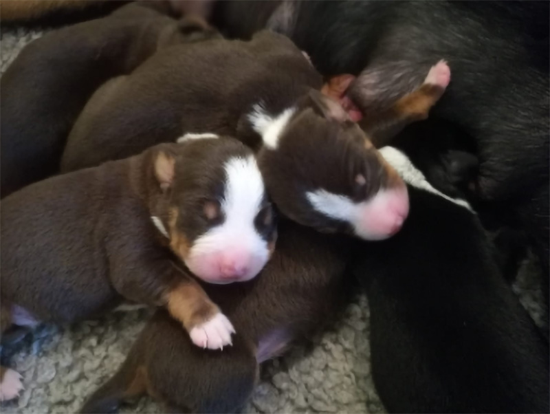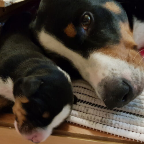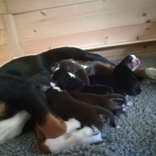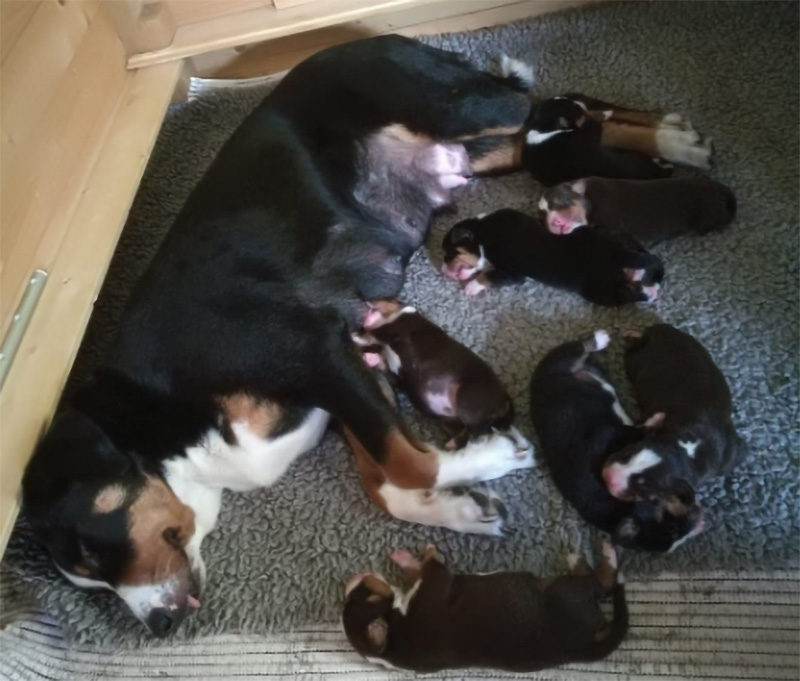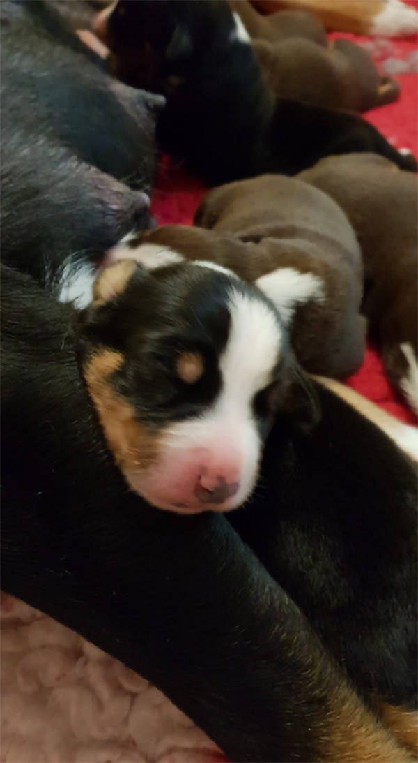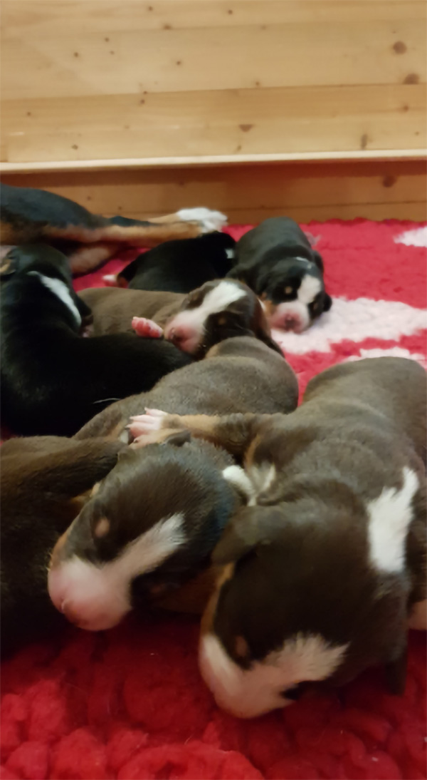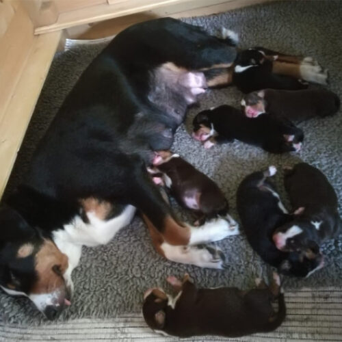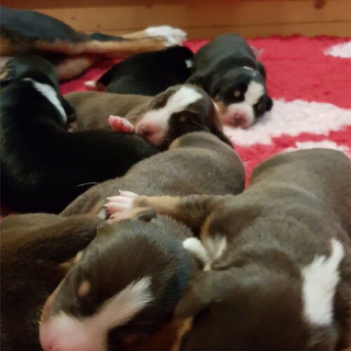 Endlich ist es soweit und seit einer Woche ,am 01.07.2019 ist wieder Freude und Glück in unser Haus eingezogen. Denn innerhalb weniger Stunden brachte Frieda 7 Welpen auf die Welt. Ohne Stress und Hektik eine wirkliche Bilderbuchgeburt. 2 Rüden und 5 Hündinnen liegen nun in der Wurfbox und wuseln umher. Was uns ganz besonders freut, mit diesem Wurf haben wir einen Teil unserer Linie wieder reingeholt und sogar 4 braunen Appenzellern das Leben geschenkt. Nun möchte ich euch aber ein paar Schnappschüsse zeigen, viel Spaß beim ansehen.